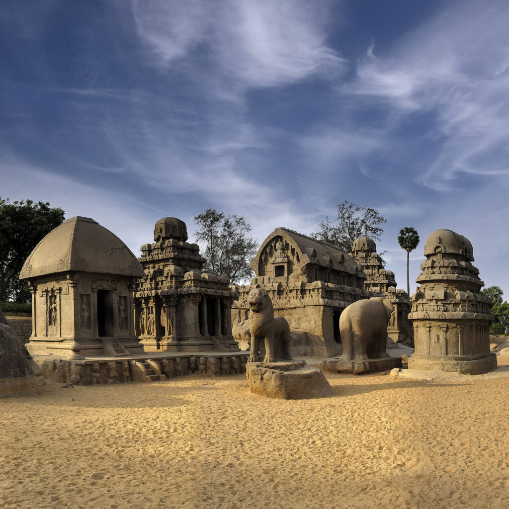 The Pancha Rathas, or Five Rathas, are monolithic rock-cut temples carved from single pieces of stone. Each ratha is dedicated to a character from the Mahabharata— Dharmaraja, Bhima, Arjuna, Nakula-Sahadeva, and Draupadi—though they were never intended for worship. These structures display early forms of Dravidian temple architecture and show experimentation with different shapes, layouts, and towers. The largest, Dharmaraja Ratha, resembles a multi-storied vimana and is noted for its beautifully carved sculptures of deities and guardians. The Arjuna Ratha features elegant carvings and typical Pallava roof patterns. Draupadi Ratha is the smallest and resembles a simple shrine, decorated with motifs of goddess Durga. The group stands as a perfect illustration of how ancient sculptors could transform solid rock into fully formed architectural wonders. The layout of the rathas resembles a procession of chariots, giving the site its poetic name. The surrounding animal sculptures, including the famous monolithic elephant and lion, enhance the artistic value. The Pancha Rathas serve as a crucial link in understanding the evolution of South Indian temple architecture.
